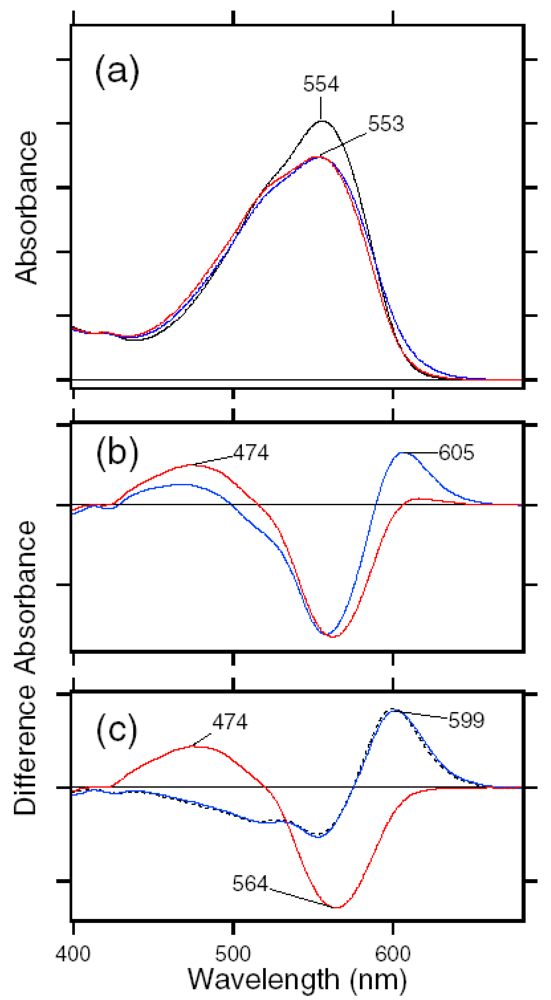 In spectroscopic studies of archaeal rhodopsins, it is important to distinguish between the separate the photocyclization products of the all-trans from the 13-cis forms. In the case of BR, a well-known light adaptation procedure leads to a complete all-trans form. On the other hand, Vogeley et al. reported that ASR has a maximal amount of the all-trans form in the dark (>75%), while light adaptation rather decreases the amount of the all-trans form [16]. This was reproduced in this study, and hence, we used the dark-adapted ASR sample. The absorption maximum of the all-trans enriched ASR was located at 549 nm, which was the same value previously reported [16]. Low-temperature UV-visible spectroscopy of ASR showed that the red-shifted intermediate (ASRK) is formed at 77 K. The difference absorption maximum was located at 593 nm, and we estimated the absolute absorption maximum of ASRK at 589 nm (data not shown).