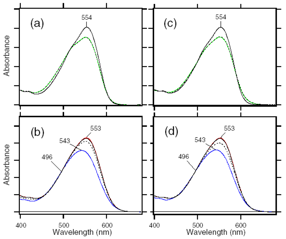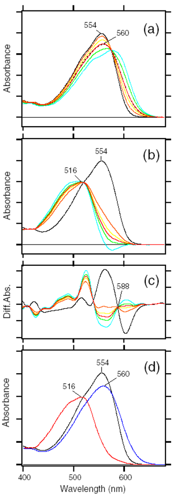 In fact, S-H stretching vibrations in D2O are observed in Figure 11a (2,547 and 2,537 cm-1). The S-H stretching frequency of cysteine appears in the 2,580–2,525 cm-1 region. Thus, the frequency change from 2,547 to 2,538 cm-1 suggests that the cysteine forms a considerably strong hydrogen bond upon retinal isomerization. The non H-D-exchangeable nature of the cysteine S-H group presumably results from either the hydrophobic environment or the strong hydrogen bond.