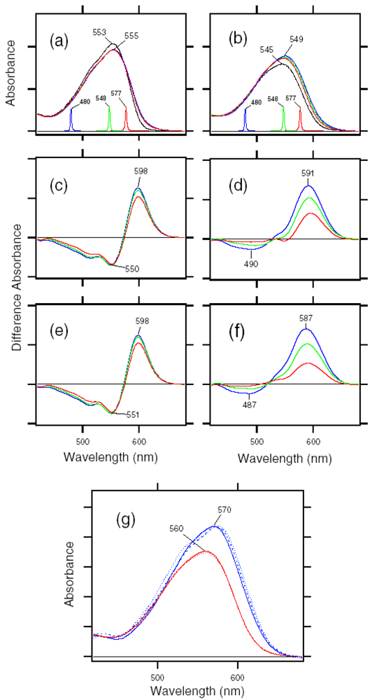 - Bergo, V.B.; Ntefidou, M.; Trivedi, V.D.; Amsden, J.J.; Kralj, J.M.; Rothschild, K.J.; Spudich, J.L. Conformational changes in the photocycle of Anabaena sensory rhodopsin: absence of the Schiff base counterion protonation signal. J. Biol. Chem. 2006, 281, 15208–15214. [Google Scholar]