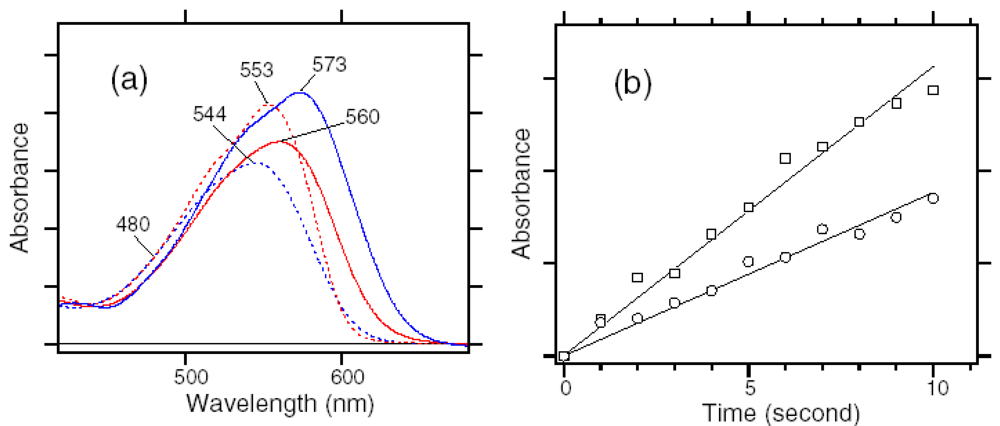 The negative band at 1,537 cm-1 corresponds to the ethylenic stretching vibration of the all-trans chromophore in ASR, which exhibits an absorption maximum at 549 nm [16]. The frequency is in good agreement with the well-known linear correlation between the ethylenic stretching frequencies and absorption maxima for various retinal proteins [29]. In the case of BR, the bands at 1,530(−)/1,514 (+) cm-1 correspond to the ethylenic stretching vibrations of the unphotolyzed and K intermediate (BRK) states, respectively (Figure 7b). On the other hand, two positive bands appeared at 1,545 and 1,523 cm-1 for ASR (Figure 7a). According to the ethylenic stretching frequencies and absorption maxima correlation we predicted the ethylenic stretch of ASRK (589 nm) to be at 1,525 cm-1. Therefore, the 1,523 cm-1 band is likely to be the latter, and the band at 1,545 cm-1 can possibly be assigned to the amide II mode. A similar observation was made for halorhodopsin [30], where the K intermediate exhibits two positive bands at 1,538 and 1,514 cm-1 with a negative band at 1,525 cm-1.