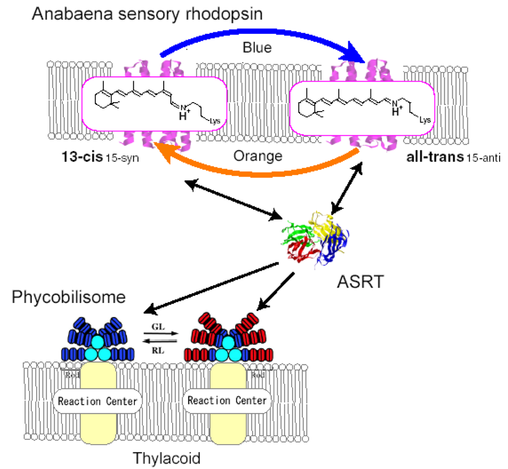 Proposed function of Anabaena sensory rhodopsin (1XIO[16]). ASR is interconverted into two isomeric states, which have different interactions with ASRT (2II9) [17]. ASRT maybe controls the expression level of phycobilisome proteins (phycocyanin and phycoerythrin) [15]. Phycobilisome graphic is from Grossman et al. [18]