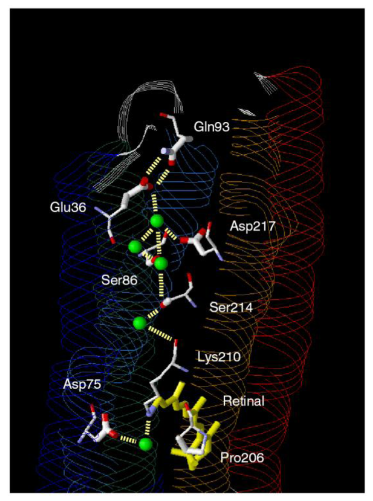 As mentioned, comparison of the amino acid sequences of ASR and BR shows that some important residues for the proton pump in BR are replaced in ASR (Figure 5). The most characteristic replacement is Pro206 at the corresponding position of Asp212 in BR, Asp212 counterions a counterion complex of the Schiff base in BR, and the aspartate is highly conserved among archaeal rhodopsins. How is the hydrogen bonding network around the Schiff base modified in ASR by the presence of Pro206?