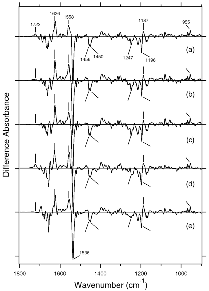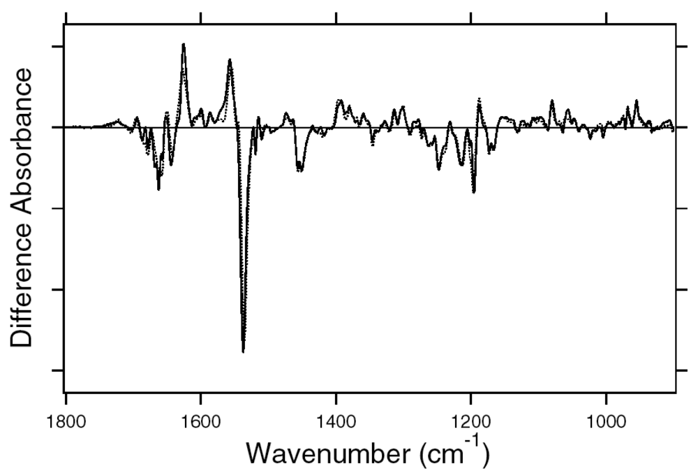 In this study, we measured the ASRK minus ASR spectra by means of low-temperature FTIR spectroscopy. For this purpose, ASR was expressed in E. coli, and the wild-type protein was reconstituted into PC liposomes. It is noted that the ASR molecule is not embedded in the native membrane, which could modify the FTIR spectra. For instance, H-D exchange could be different between PC liposomes and the native membrane, a fact that should be elucidated in the future. However, this study focuses on the structural changes near the retinal upon photoisomerization, and the light-induced difference FTIR spectra are not significantly affected by different lipid environments.
