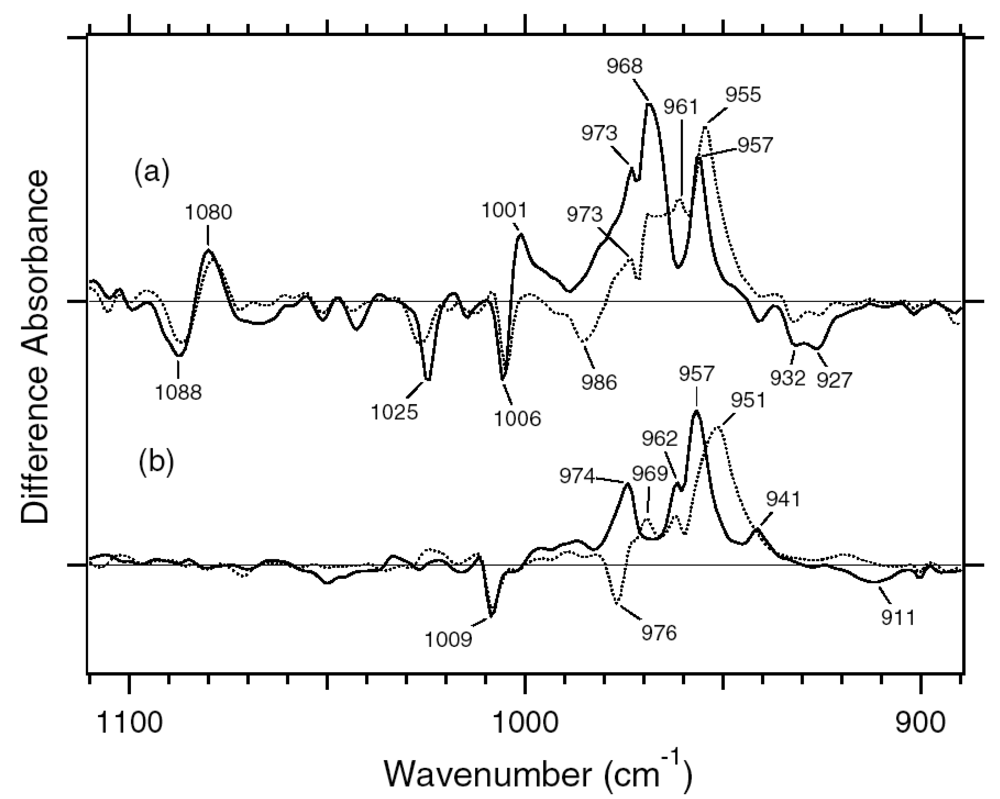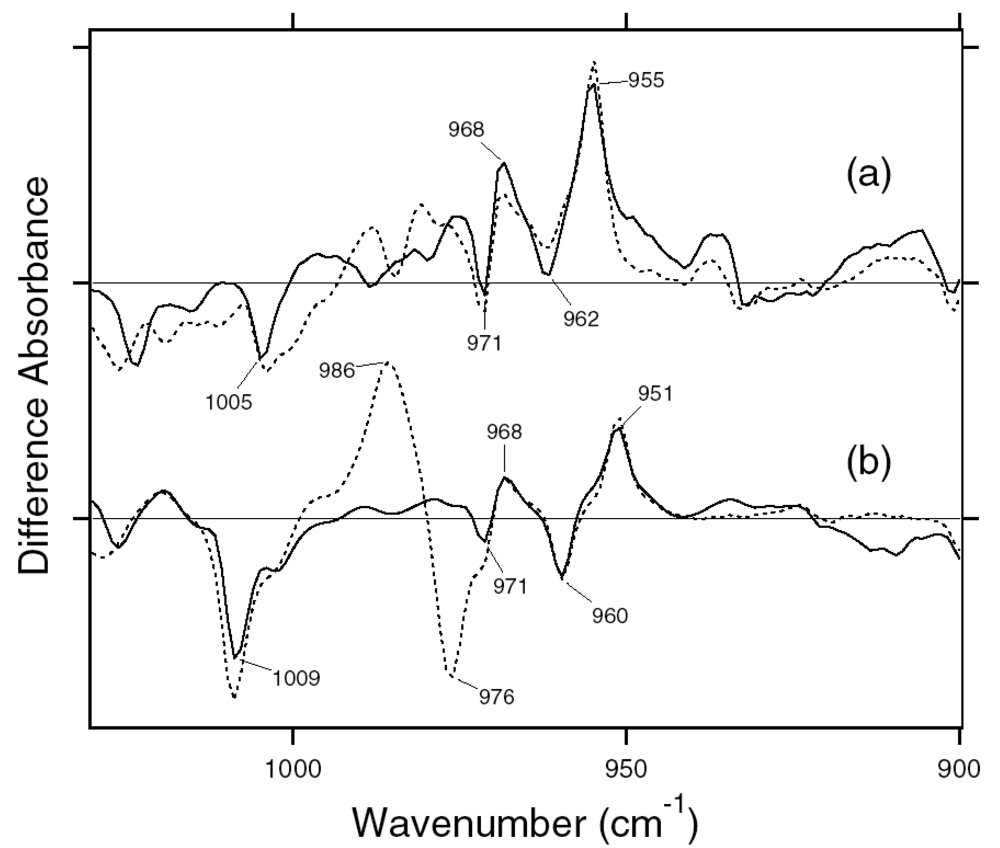 The ASRK minus ASR (a) and the BRK minus BR (b) spectra in the 1,110–890 cm-1 region, which correspond to hydrogen-out-of-plane (HOOP) vibrations of the retinal chromophore. The sample was hydrated with H2O (solid lines) or D2O (dotted lines). One division of the y-axis corresponds to 0.002 absorbance units. This figure is reprinted with permission from Furutani et al. [20]. Copyright 2005 American Chemical Society.