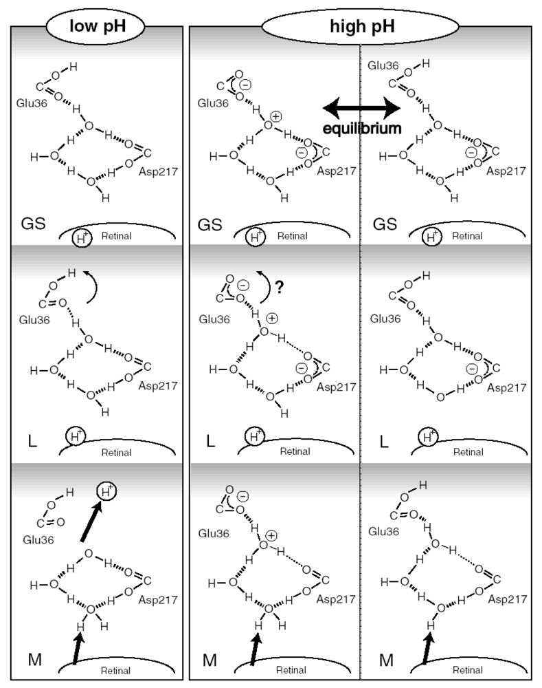 On the basis of our FTIR studies of BR mutants and other rhodopsins, we have found an interesting correlation between strongly hydrogen bonded water molecules and proton pump activity. Among various BR mutant proteins we have studied, only D85N and D212N lack strongly hydrogen bonded water molecules. Other BR mutants possess their O-D stretches at <2,400 cm-1, which include T46V, R82Q, R82Q/D212N, T89A, D96N, D115N, Y185F, and E204Q [54]. Among these mutants, only D85N and D212N do not pump protons. Therefore, strongly hydrogen bonded water molecules are only found in the proteins exhibiting proton pumping activities. The correlation between proton pumping activity and strongly hydrogen bonded water molecules is true not only for BR mutants but also for various rhodopsins. Whether rhodopsins possess strongly hydrogen bonded water molecules has been examined systematically. We found that BR and pharaonis phoborhodopsin [26,36,46], both of which pump protons, possess such water molecules (O-D stretch at <2,400 cm-1 in D2O). In contrast, strongly hydrogen bonded water molecules were not observed for halorhodopsin [55], Neurospora rhodopsin [37], and bovine rhodopsin [56]. It is known that none of them pumps protons. Such comprehensive studies of archaeal and visual rhodopsins have thus revealed that strongly hydrogen bonded water molecules are only found in the proteins exhibiting proton pumping activities. Taken together, these results for ASR suggest that the strong hydrogen bonds of water molecules and their transient weakening may be essential for the proton pumping function of rhodopsins.