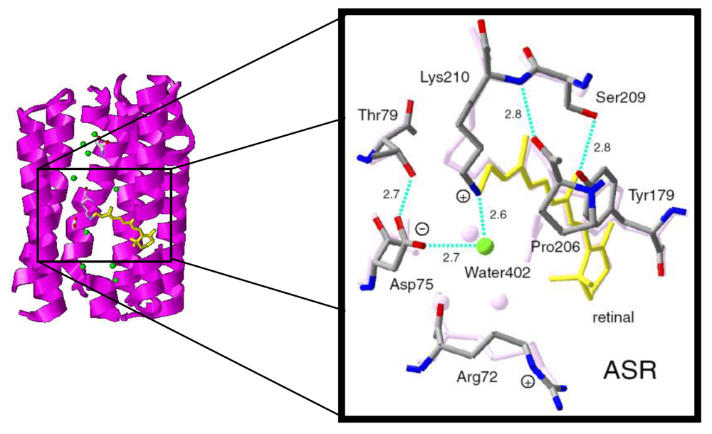 (Left) X-ray crystallographic structure of ASR (1XIO[16]). Purple ribbons, green spheres, yellow and white sticks correspond to helices, water molecules, retinal and amino acid residues, respectively. (Right) The Schiff base region of ASR and BR (translucent structure, 1C3W [7]), respectively. Each retinal molecule between ASR and BR is fitted to compare the hydrogen-bonding networks by using Swiss-PdbViewer [19]. Top and bottom regions correspond to the cytoplasmic and extracellular sides. The green sphere (Water 402) represents a water molecule which forms a hydrogen bond bridge between the protonated Schiff base and its counterion, Asp75. Hydrogen-bonds (blue dashed lines) are inferred from the structure and the numbers are the hydrogen-bond distances in Å. This figure is adapted with permission from Furutani et al. [20]. Copyright 2005 American Chemical Society.