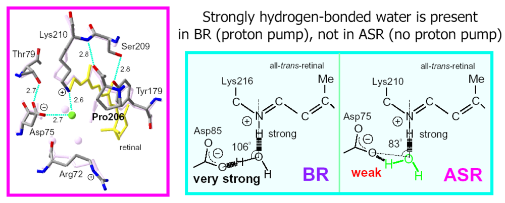 Like BR, ASR has a bridged water molecule between the Schiff base and Asp75 (Figure 4). However, Section 2 clearly showed the absence of strongly hydrogen-bonded water molecules in ASR. The reason for the lack of strongly hydrogen bonded water molecules in ASR was explained by the difference in the geometry of the hydrogen bond. Figure 40 shows that the N-Owater-OAsp75 (the Schiff base nitrogen, the water oxygen, and the oxygen of Asp75, respectively) angle in ASR is 83°. The corresponding N-Owater-OAsp85 angle in BR is 106° (Figure 40). As the consequence, if the water oxygen fully accepts the hydrogen bond of the Schiff base, the O-H group of water points toward the oxygen of Asp85 in BR, but not toward that of Asp75 in ASR (Figure 40). Such a small difference in angle possibly determines the hydrogen bonding strength of water molecules. On the basis of our FTIR studies of BR mutants and other rhodopsins, we have found the strong correlation between strongly hydrogen bonded water molecules and proton pump activity. It is likely that the strong hydrogen bond of the bridged water molecule is essential for the proton-pumping function of rhodopsins, presumably because of light-energy storage through transient weakening by retinal photoisomerization. Photo-cyclic reaction is important for the efficient proton pumping in rhodopsins. Thus, weak hydrogen bond of the Schiff base water is one of the key characters in ASR.