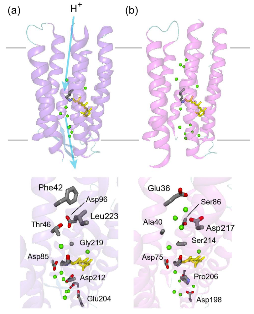 X-ray crystallographic structures of BR [7] (a) and ASR [16] (b). Top and bottom panels represent views from the membrane plane and the cytoplasmic side, respectively. In the top panel, top and bottom regions correspond to the cytoplasmic and extracellular sides, respectively. The retinal chromophore is colored yellow, and green spheres represent internal water molecules.