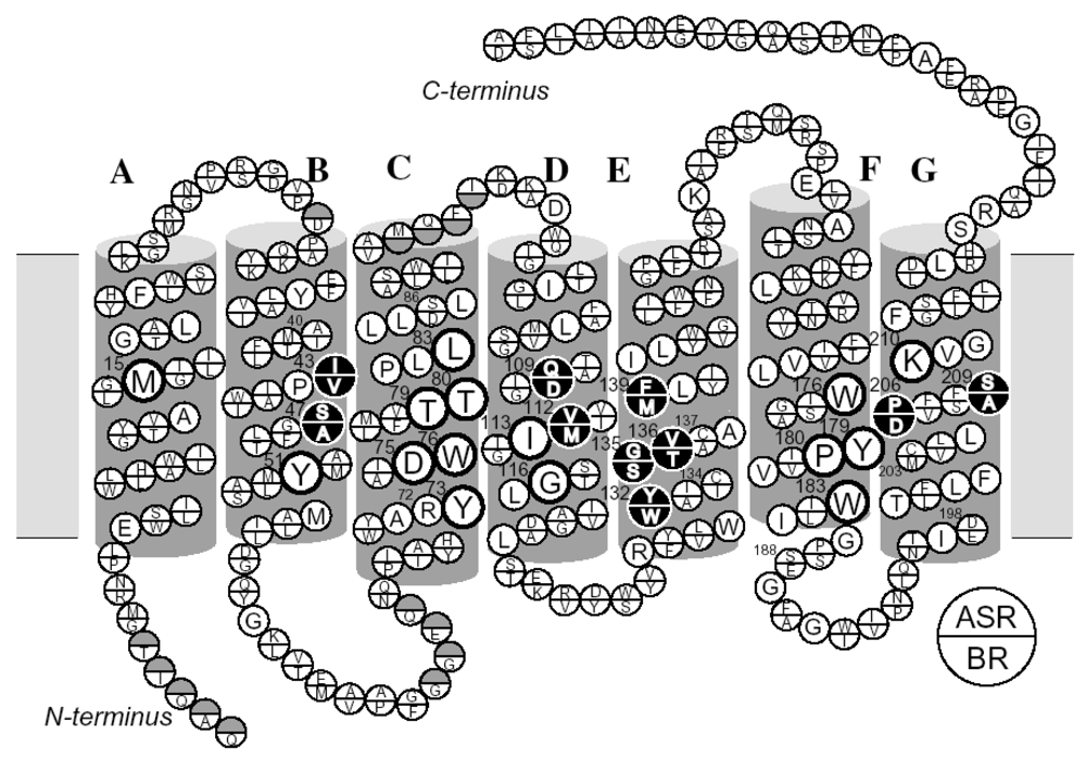 Comparison of amino acid sequences of ASR and BR. The transmembrane topology is based on the crystallographic three-dimensional structures. The sequence alignment was done using CLUSTAL W [21] with the default settings. Single letters in a circle denote residues common to ASR and BR. The residues that are different in ASR and BR are denoted at the top and bottom of the circles, respectively. The residues forming the retinal binding site within 5 Å of the chromophore are shown by bold or filled circles. This figure is reprinted with permission from Furutani et al. [20]. Copyright 2005 American Chemical Society.