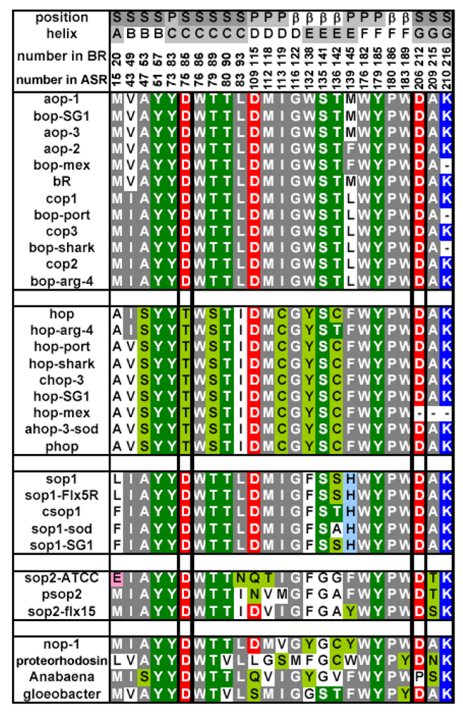 The 25 amino acid sequence of archaeal-type rhodopsin around retinal. First, second, third, fourth and fifth categories represent the families of bacteriorhodopsin, halorhodopsin, sensory rhodopsin I, sensory rhodopsin II and other archaeal-type rhodopsins, respectively. position S: near the Schiff base, P: near the polyene chain, β: around the β-ionon ring.
