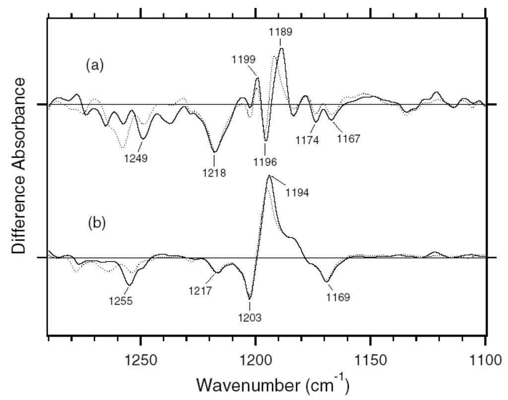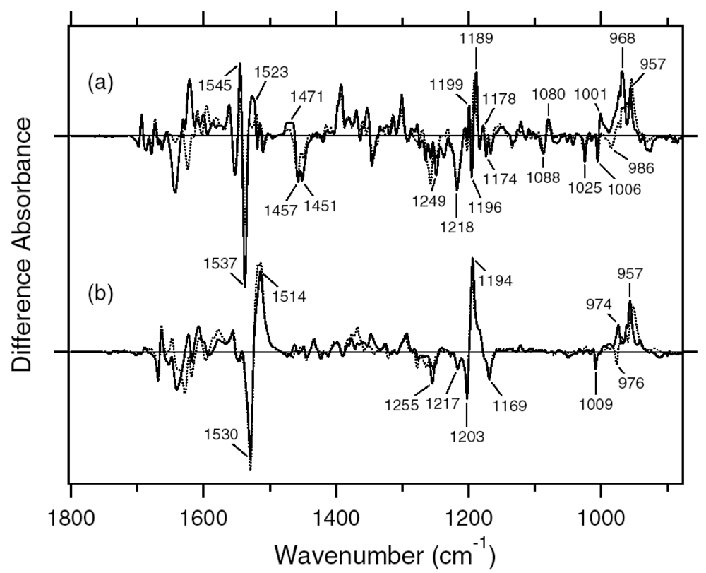 The 13C-ASRK minus 13C-ASR (a) and the AT-ASRK minus AT-ASR (b) spectra (pH 7) in the 1,800–800 cm-1 region measured at 77 K upon hydration with H2O (solid line) and D2O (dotted line), respectively. The spectra in panel b are reproduced from Furutani et al. [20]. One division of the y-axis corresponds to 0.007 absorbance units. This figure is reprinted with permission from Kawanabe et al. [59]. Copyright 2006 American Chemical Society.