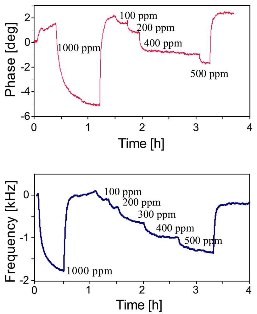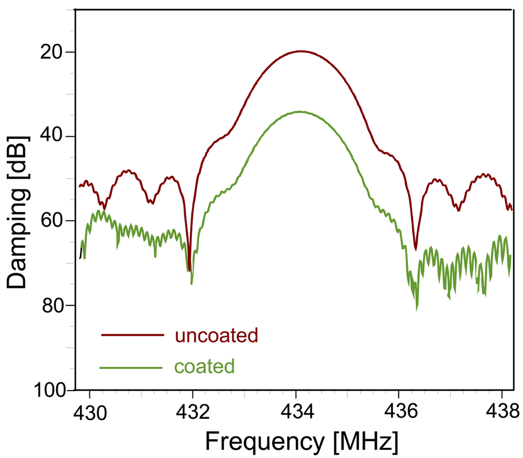 - Dickert, F.L.; Forth, P.; Bulst, W.-E.; Fischerauer, G.; Knauer, U. SAW devices—sensitivity enhancement in going from 80 MHz to 1 GHz. Sens. Actuat. B 1998, 46, 120–125. [Google Scholar]