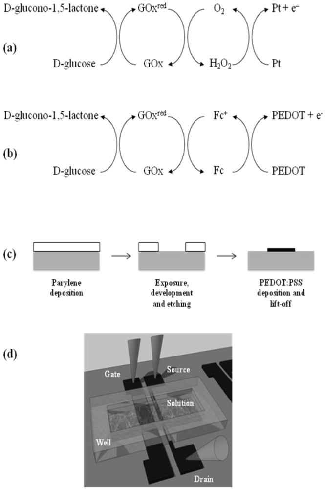 Reaction cycles for detection of glucose in devices utilizing a Pt electrode (a) and in devices utilizing a PEDOT:PSS electrode and a ferrocene mediator (b). Diagram of the OECT fabrication process (c), and layout of a finished device, not to scale (d).