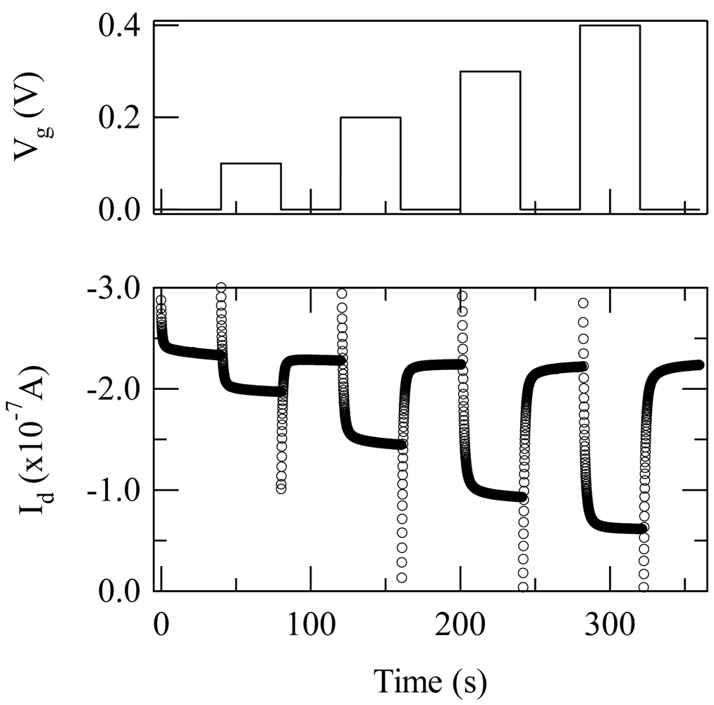 Figure 2 shows the response of an OECT for Vd = −0.2 V and for Vg pulsed between 0.1 and 0.4 V. The well was preloaded with a mixture that contained ferrocene, as described above, into which 10 μL of 10 mM glucose solution was added. The application of a positive gate voltage causes a reversible decrease in the current that flows in the channel, and the magnitude of the current is associated with the amount of glucose present in the well [14]. The decrease in current is due to de-doping of the polymer channel caused by cations from the electrolyte. The exact amount of de-doping depends on the potential drop between the electrolyte and the polymer channel, which, in turn, depends on charge transfer reactions that take place at the gate electrode. A quantitative treatment of this was recently presented by Bernards et al.[16].