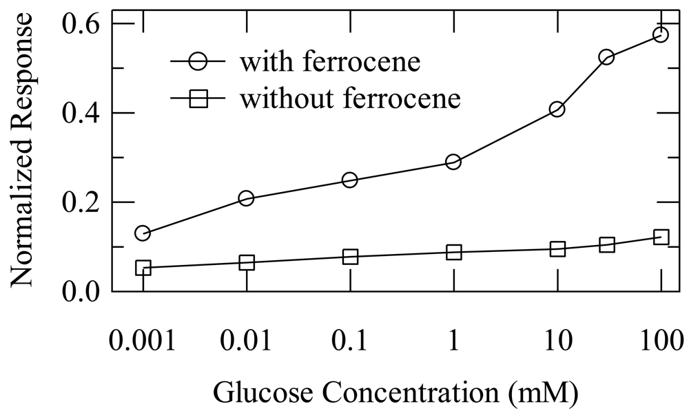 where Idconc=0 is measured for a reference solution without glucose and Idconc is measured for a glucose solution at the concentration of interest. This normalization provides a maximum range of response from zero (no glucose) to one (fully de-doped channel) and facilitates comparison between different devices (the typical batch-to-batch reproducibility in terms of Idconc=0 was of the order of 10%). When the transistor well is preloaded with a mixture that does not contain ferrocene, the normalized response (open squares in Figure 3) is small and shows only a small variation across the glucose concentration range. This is consistent with our previous work in which it was necessary to use Pt electrodes to obtain a high current modulation [14,16].