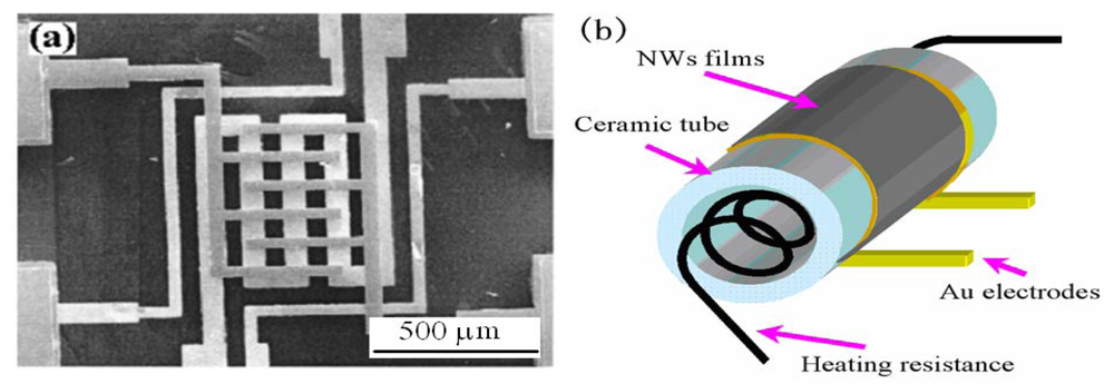 (a) MEMS structures with interdigitated electrode [7]. (b) Schematics of nanowire gas sensors on ceramic tube [26].