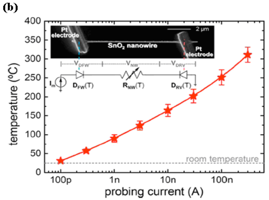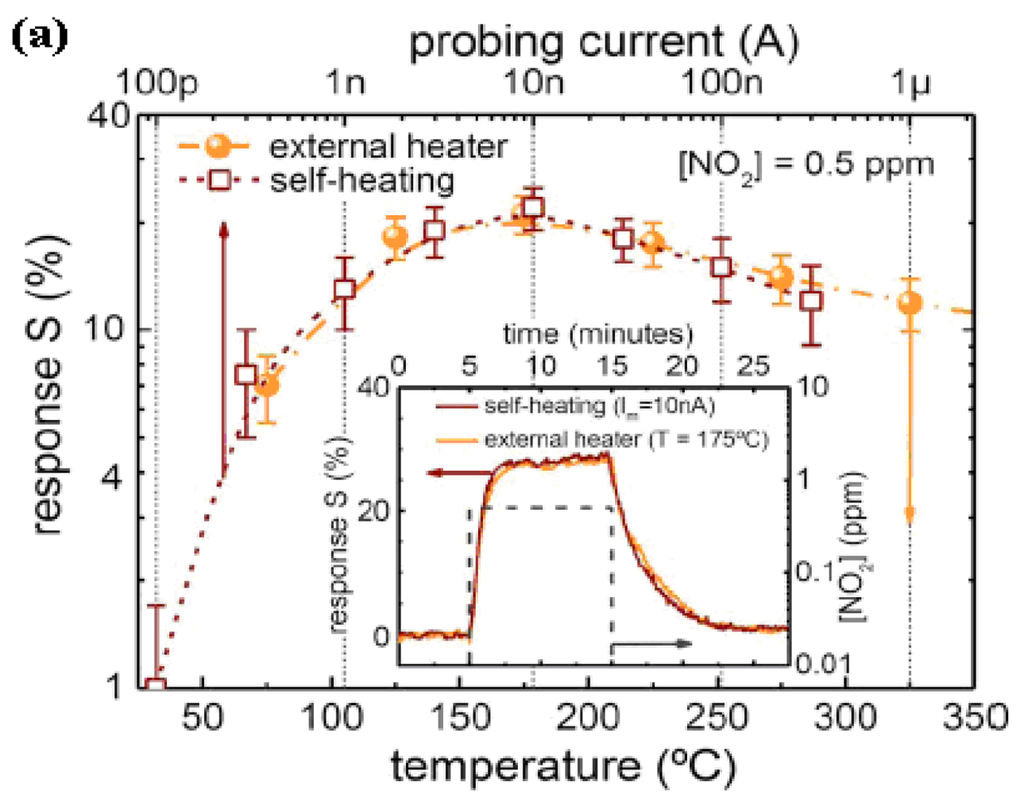 Kolmakov et al. [91] investigated the self-heating effect on the operation of single SnO2 nanowire gas sensors towards oxygen or hydrogen in oxygen and their sensor was able to operate without a heater, consuming only a few microwatts of power. Prades et al. [92] further tested the idea of optimizing the sensing conditions for the detection of gaseous species without the aid of an extra heater, which helps reducing the power consumption of the devices. They fabricated individual SnO2 nanowire devices and measured their sensing properties towards a specific concentration of NO2 under various input current and heating temperature respectively. Then they compared the calibration curve of each measuring method (Figure 10a) and generate a curve (Figure 10b) that correlate the input current and the effective temperature (roughly estimated through the response and recovery times obtained under each operating conditions) it achieves which can help further improvement of future prototype performances. Their devices operated optimally with less than 20μW for NO2 sensing to both bias and self-heating, and is significantly lower than the 140 mW required for the external microheater.