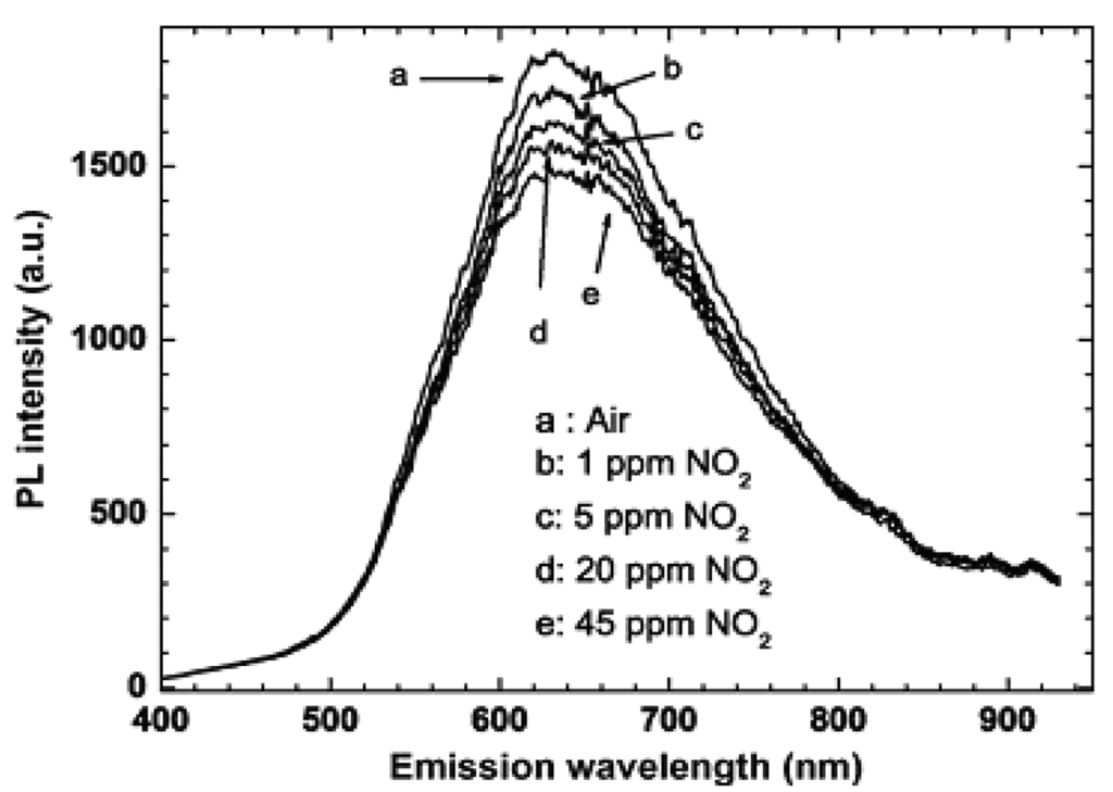 photoluminescence spectrum of SnO2 nanowires sample measured at room temperature in dry air and in nitrogen dioxide atmosphere at different concentrations [96].