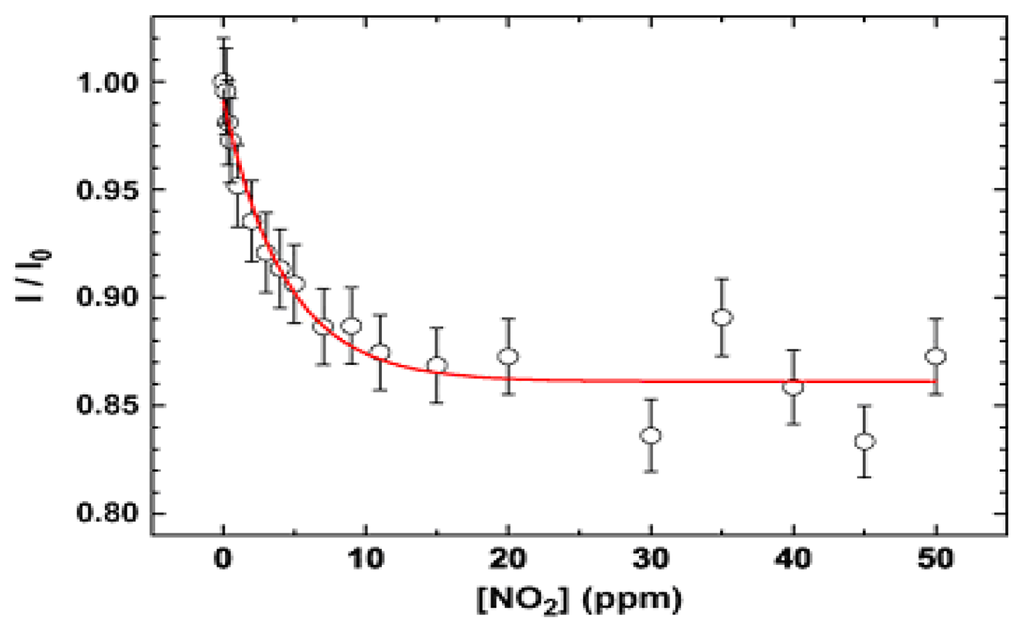Quenching ratio at room temperature as a function of the NO2 concentration; solid curve is a best fit to data obtained by using the function I = IB + (I0−IB)exp(−γ [NO2]). The IB term represents a quencher-independent “background” contribution to PL [96].