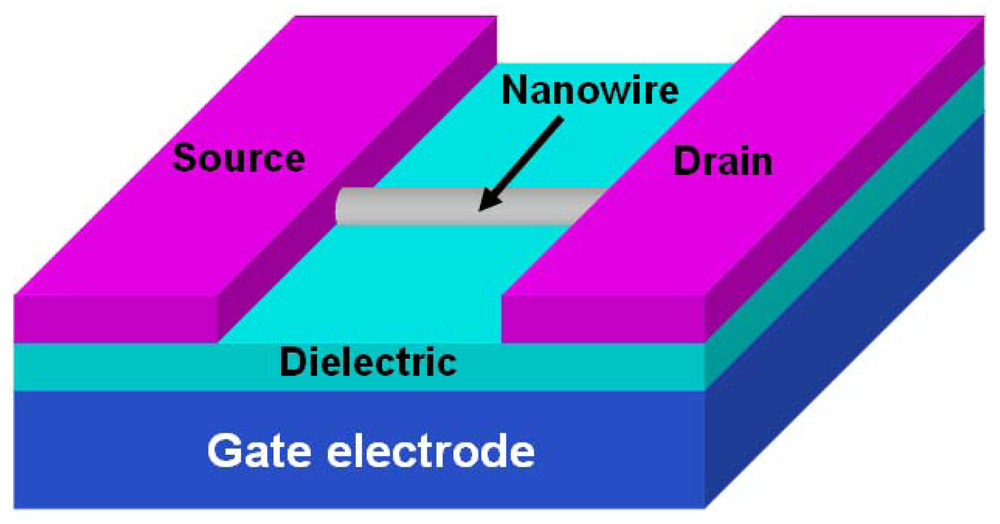 Up to now, one-dimensional metal oxide nanostructures sensors have been characterized in three ways: conductometric, field effect transistor (FET) and impedometric ones. Conductometric sensors are based on resistance changes caused by exposure of the sensor surface to a target species. So far, two types of conductometric nanowire gas sensors have been mainly fabricated: one is the film type, in which a film composed of nanowires is contacted by pairs of metal electrodes on a substrate (Figure 1a) or a ceramic tube (Figure 1b); the other is the single nanowire type in which a single nanowire bridges two metal electrodes on a heavily doped silicon substrate covered with SiO2 acting as insulating layer between the nanowire/electrode combinations and the conducting silicon (Figure 2). In the fabrication of film type nanosensors, nanowires products are usually pulverized to a pulp state and either directly painted or screen-painted [16] onto the substrates or tubes. But other approaches are reported. Sometimes nanowire growth is integrated into device fabrication [17-20]: SiO2/Si substrates with patterned metal coatings were used to catalyze the growth of the metal oxide nanowires and the coating also acts as electrodes contacting the sensing material. This type of sensor has lower contact resistance compared to the previous one because the nanowire growth process is integrated into device fabrication. Well-aligned nanowire arrays have been fabricated into nanosensors to explore benefits brought about by orderliness.