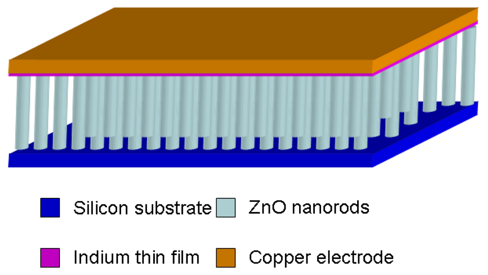 For instance, Figure 3 shows the sensor device structure that has been adopted in exploring gas sensing properties of ZnO nanorods [21], in which ZnO nanorod arrays are sandwiched between the silicon substrate supporting their growth and an indium thin film that forms ohmic contact with the nanorods and the copper electrode. Another interesting approach to assemble nanosensors involves combining two vertically aligned CuO nanowire arrays into a three-dimensional nanostructure, in which two pieces of nanowire arrays were attached to the copper plate and the micromanipulator tip (copper wire) and the distance between the two arrays can be adjusted. The sensor built in this style was reported to be capable of detecting air-diluted H2S at the parts per billion level [22]. However, these aligned nanowire arrays are grown by “bottom up” methods, and the orderliness is not as good as those fabricated via “top to bottom” approaches. Francioso and Son et al. employed microelectronics processes such as photolithography and plasma etching (demonstrated in Figure 4) to fabricate TiO2 [23] and ZnO [24] parallell nanowire arrays, respectively, and investigated their gas sensor behaviors. Son et al. [25] developed an alternative technique to construct well-aligned nanowire arrays, which takes advantage of the two facts: 1) the step edges of terraces are energetically favorable for the nucleation of adatoms; 2) a low deposition rate is favorable for producing localized nucleation at the step edges of terraces. They prepared uniform terraces on (0001) sapphire substrates by annealing a miscut sapphire substrate and minimized the ZnO deposition rate by using low laser pulse repetition rate as well as a shadow mask which blocks direct ZnO plume generated by laser ablation pulsed laser deposition (PLD).