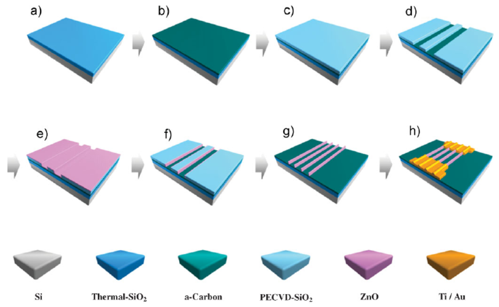 Schematic diagram illustrating the fabrication processes of the ZnO nanowire device based on nanoscale spacer lithography (NSL): (a) thermal growth of SiO2 layer, (b) deposition of a-carbon thin film (act as etch-stop layer in subsequent process), (c) plasmon enhanced chemical vapor position (PECVD) of SiO2 thin film (sacrificial layer), (d) sacrificial layer patterning, (e) atomic layer eposition (ALD) of ZnO thin film, (f) top view of the chip after plasma etching of ZnO, (g) sacrificial layermoval,and (h) top view of the ZnO nanowire device after metal electrode deposition [24].