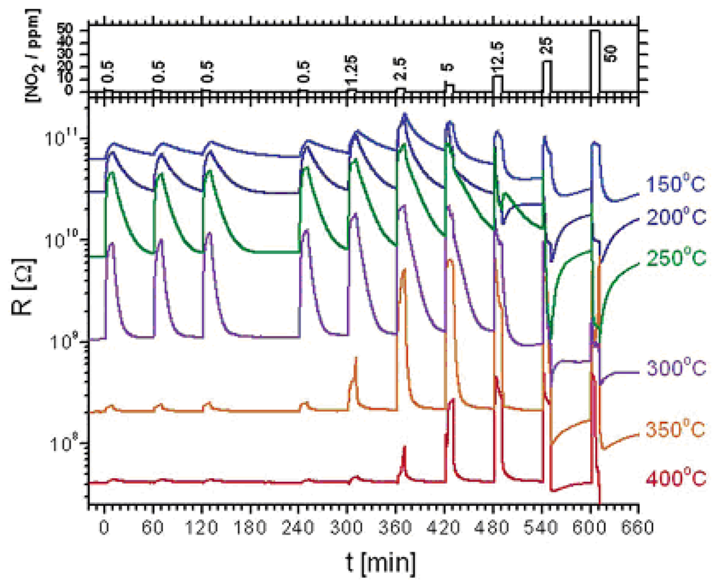 The resistance response during cyclic exposure to 10 min pulses with increasing concentrations of NO2 mixed in dry air at various operating temperatures [31].