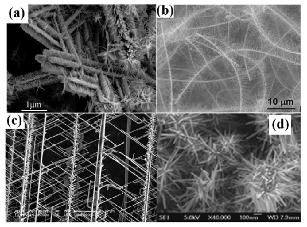 (a) SEM images of ZnO brushes [67]. (b) SnO2 brushes [28]. (c) ZnO dendrites [68]. (d) ZnO nanoflowers [69].