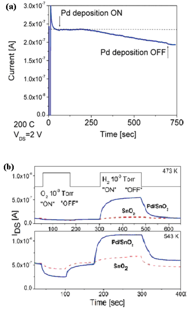 (a) changes in the source drain current during the early stage of Pd deposition onto a SnO2 nanobelt. (b) current response of an undoped (dashed line) and Pd-functionalized (solid line) nanostructure to sequential oxygen and hydrogen pulses at 473 K (right top pane) and 543 K (right bottom) [72].