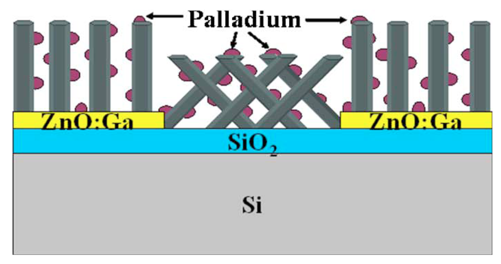 Schematic for the the cross sectional view of ZnO nanowire array deposited with Pd nanoparticles [75].
