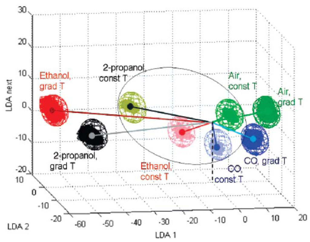 The state-of-the-art multielectrode KAMINA platform is based on the second idea. Kolmakov et al. combined KAMINA technology with “bottom-up” SnO2 nanowire mats as the sensing elements [90]. They applied the statistical method linear discriminant analysis (LDA) to transfer sensor signals collected from all 38 channels into an optimized coordinate system of lower dimensionality equal to the number of training gases minus one (Figure 9).