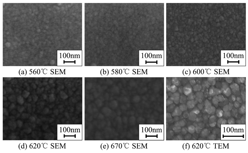 The surface morphology of PSNFs was characterized by SEM, as shown in Figures 1(a)-(e). It can be seen that the grain size increases with elevating deposition temperature. This indicates that the crystallinity of PSNFs can be improved by raising deposition temperature. The grain size can be determined by TEM, as shown in Figure 1(f). The mean grain size of 620°C samples is estimated to be 40 nm approximately. With the deposition temperature varying from 560°C to 670°C, the mean grain size increases from 30 nm to 70 nm. For the sake of clarity, the 560∼600°C films undergoing the pre-annealing of 950°C are called recrystallized (RC) PSNFs, while the 620∼670°C films are called directly crystallized (DC) PSNFs. From Figure 1, it can be seen that the borders between GBs and grains of RC PSNFs are obscure as well as the 670°C samples. It shows that the GBs of the above-mentioned samples contain a large number of amorphous phases.