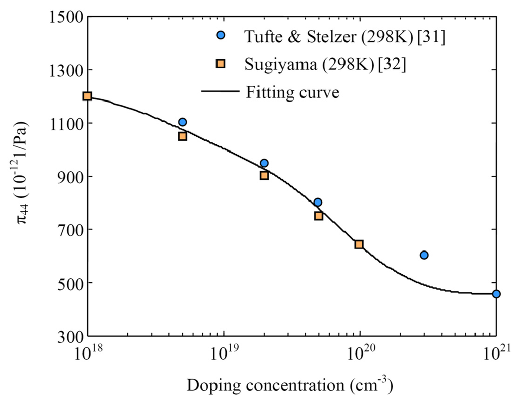 Fitting curve of shear piezoresistance coefficient π44 on the doping concentration NA based on the experimental results from Tufte [] and Sugiyama [].