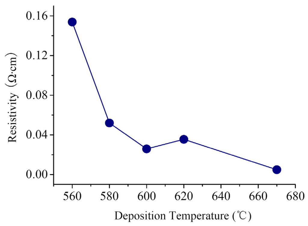 Figure 12 provides the resistivity versus the deposition temperature. It can be seen that the resistivity changes from 1.54×10-1 to 4.9×10-3 Ω·cm with elevating deposition temperature. Considering the experiment results that the grain size increases with raising deposition temperature, it indicates that the weight of the resistivity of composite GBs ρb in the film resistivity ρ is reduced by increasing deposition temperature. Because ρb is dependent on the resistivity of GB barriers ρδ and the resistivity of DRBs ρd (i.e., ρb = ρδ + ρd), the elevation of deposition temperature might reduce either of ρδ and ρd. According to the SEM and XRD results, there are more amorphous contents in RC PSNFs than in DC PSNFs. The existence of amorphous phases at GBs could increase the resistivity ρδ. On the other hand, the high doping concentration narrows the DRB width to a few angstroms, so that the contribution of ρd to ρb could be neglected. Therefore, at high doping concentration, the resistivity ρb is mainly dependent on the resistivity ρδ, and the reduction of amorphous contents at GBs caused by elevating deposition temperature is responsible for the falloff of the film resistivity ρ. However, the resistivity of 620°C samples is slightly higher than that of 600°C ones. It is likely due to the recrystallization of 600°C samples after the pre-annealing at 950°C, which is discussed in details in the next section.