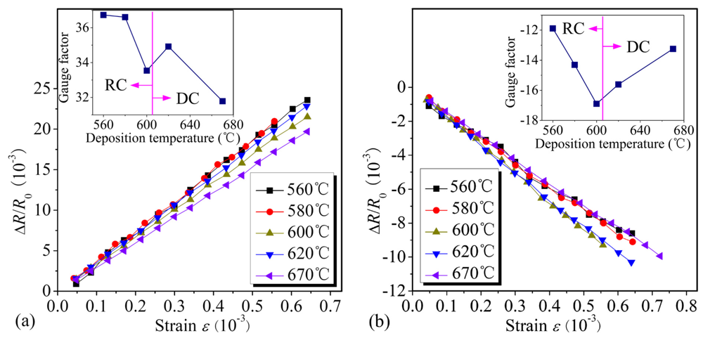 (a) Dependences of the resistance change ΔR/R0 in longitudinal piezoresistors on strain ε with different deposition temperatures, and the longitudinal GF vs. deposition temperature. (b) Dependences of ΔR/R0 in transversal piezoresistors on strain ε with different deposition temperatures, and the transversal GF vs. deposition temperature.