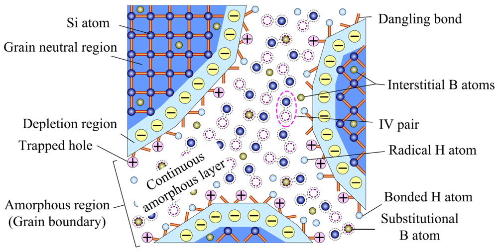 In this paper, a-pockets with fewer surface IV coordination numbers are considered to be eliminated during the pre-annealing, due to their faster recrystallization rate. Therefore, GBs of PSNFs can be modeled as continuous a-layers, as shown in Figure 14. Boron dopants are ion-implanted into PSNFs, forming the interstitial atoms and substitutional atoms. The occupation of substitutional boron atoms to the vacancies also suppresses the recrystallization of IV pairs.