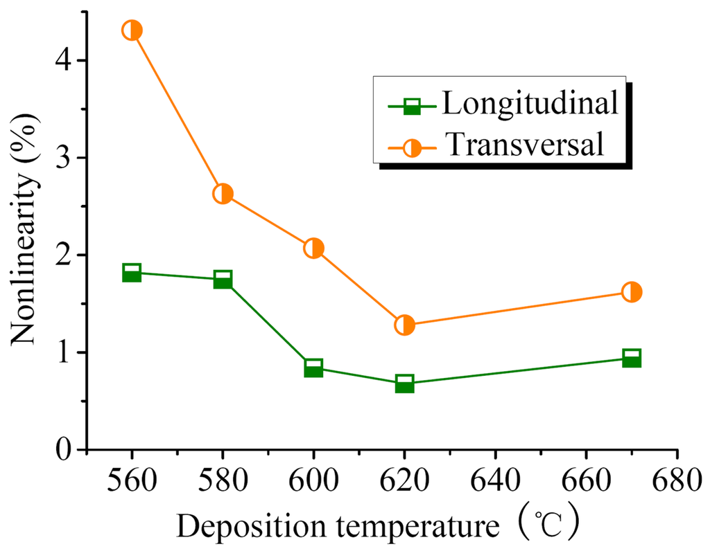 The dependences of PRNL of longitudinal and transversal PSNF piezoresistors on deposition temperature are given in Figure 15. Obviously, the PRL of longitudinal piezoresistors is superior to the transversal ones. It should be noted that the PRNL of RC PSNFs and 670°C samples is higher than 620°C samples, indicating that amorphous phases at GBs are the origin of PRNL. In the case of room temperature and small stresses, only the first-order PRCs are taken into account, and the nonlinear piezoresistance effects (high-order PRCs) in silicon [] could be neglected. Therefore, the conditions of GBs make a significant impact on the PRL.