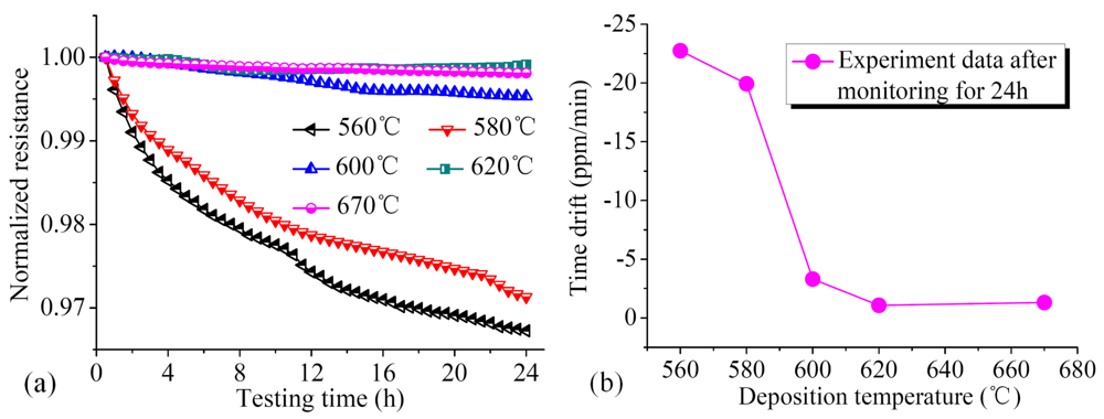 (a) Normalized resistances of PSNF piezoresistors with different deposition temperatures as a function of testing time during monitoring for 24 h. (b) RTD of PSNF resistors versus deposition temperature after monitoring for 24 h.
