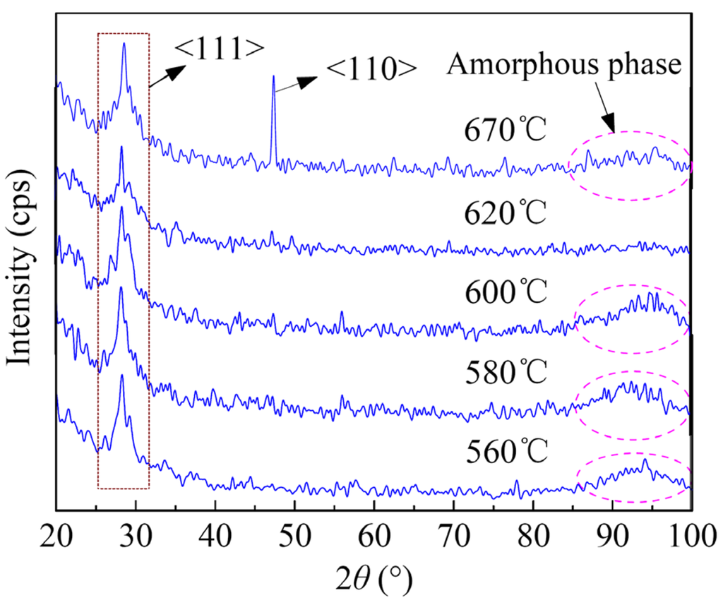 In order to analyze the film microstructure, the XRD experiment was performed on the samples. In the XRD spectra shown in Figure 2, all the <111> peaks are attributed to Si substrates. The clear <110> peak of 670°C PSNFs is due to the preferred grain growth along <110> orientation, while the other PSNFs are oriented randomly. Furthermore, it should be noted that the broad peaks (2θ=85∼100°) related to amorphous phases appear on the spectra of RC and 670°C PSNFs, thereby testifying the existence of amorphous phases at GBs. Because amorphous phases in the 620°C PSNFs are much fewer, no remarkable broad peak is observed. The peak intensity and FWHM of RC PSNFs are larger than those of the 670°C ones. It demonstrates that the crystallinity of RC PSNFs is lower than DC ones. The broad peak of 670°C samples is likely due to the preferred growth aggravating disordered states of GBs.