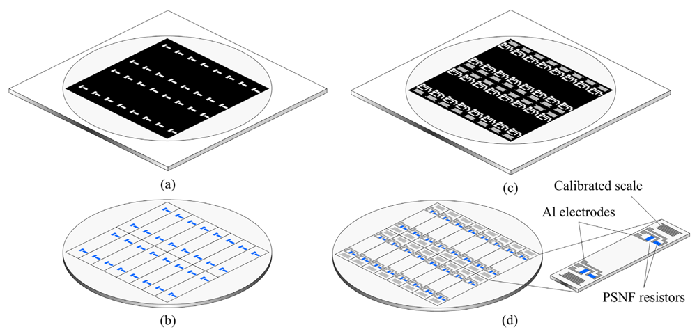 Schematic diagram of mask plates and sample wafers in the fabrication of cantilever beams. (a) The mask plate for patterning resistors. (b) The sample wafer after patterning resistors. (c) The mask plate for patterning electrodes and calibrated scales. (d) The sample wafer and the cantilever beam after fabricating electrodes and calibrated scales.
