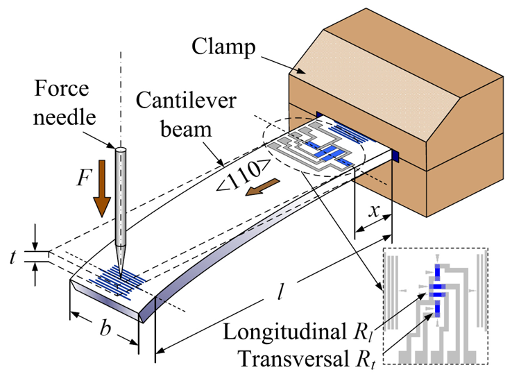 The GF test setup is shown in Figure 5. Either end of the cantilever beam is fixed by the clamp. The piezoresistors are connected to the electric instruments through Al electrodes.