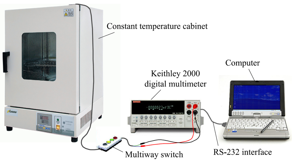 where L, W, d and RS are the length, width, thickness and sheet resistance of PSNF resistors, respectively. The RTD is defined as the relative change in the resistance value per unit time and expressed by RTD = (resistance drift/initial resistance)/testing time. For measuring RTD, the samples were placed in a constant temperature cabinet and the resistances were monitored by the Keithley 2000 digital multimeter for 24 h at 23°C (room temperature). And the measured data were collected through the RS-232 interface to the computer. The test system of RTD properties is shown in Figure 6.