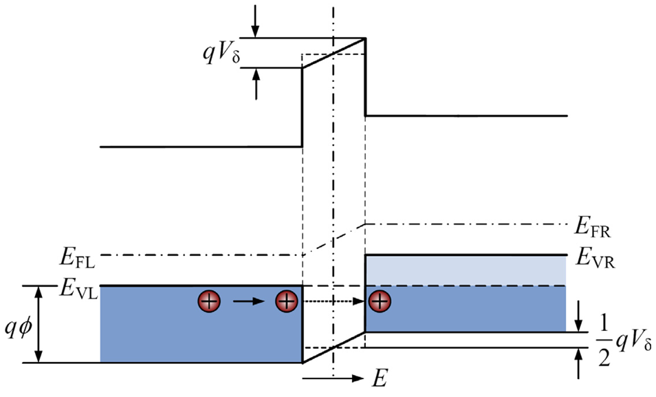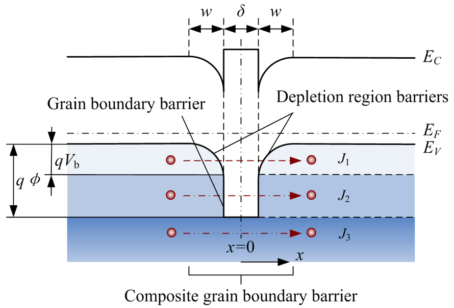 Before deducing the PRC πδ, the conduction current of carriers penetrating GB barriers must be determined. Figure 8 provides the energy band diagram and tunneling mechanism of GB barrier omitting DRBs. It is assumed that the voltage drop over the GB barrier is Vδ. Using Fermi-Dirac statistics, the number of holes having energy within the range dEx incident from left to right on the GB barrier per unit time per unit area is []: