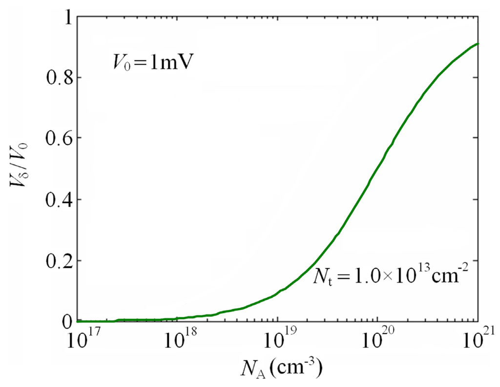 where NA is the boron doping concentration, Nt is the trap density at GBs, εs and ε0 are the relative and vacuum dielectric constants of Si, respectively. In this paper, Nt is taken to be 1.0×1013 cm-2. By calculating, the distribution of Vδ normalized to V0 as a function of NA is provided in Figure 9.