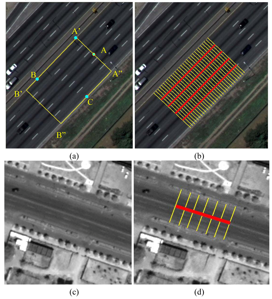 A texture measure is described in [7]. Practically, it is hard to populate ATS if it still takes variance as a measure of texture in complex scene where even intensities of one feature differ greatly. Fortunately, it could still function on a classified thematic image. As mentioned above, the initialization information derives a rectangle A′B′B″A″. And then for each band, calculate the mean M and standard deviation σ of the gray values of pixels in rectangle A′B′B″A″ respectively, then perform parallelepiped classification using ± σ as limits on the raw image. Subsequently, set the pixels of road subclass as 1, meanwhile set the pixels of any other subclass as 0, and then the mean of the rotating template is feasible too [see Figure 2(c)].