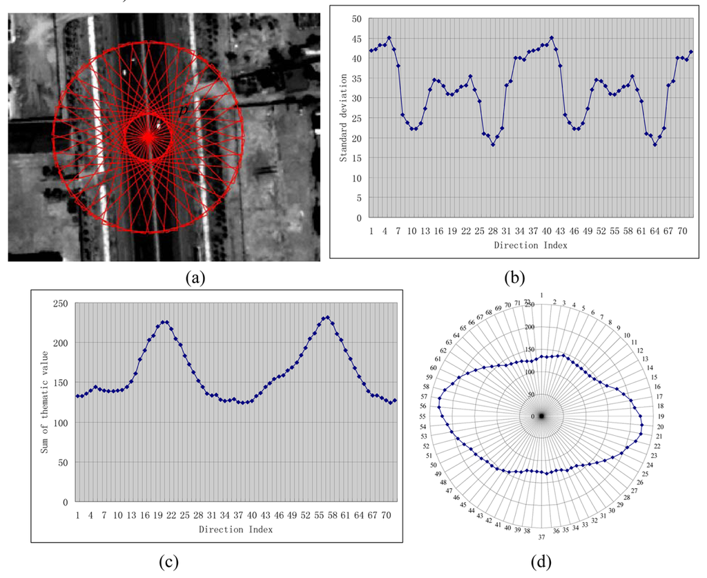 In this sense, PATS is improved and redefined to make it fit to semi-automatic road tracking as follows. At each road centerline point p, T(α, w, h, p) is defined as the mean for a rectangular set of pixels of width w and height Lsign around pixel p whose principal axis lies at an angle of α from the road direction β. This measure is computed for a set of angles α0, …, αn at pixel p. Angles α0, …, αn are with same interval δ. At the point p, the ATS is regarded as the set of values {T(α0, w, h, p), T(α1, w, h, p), …, T(αn, w, h, p)}. Figure 2(a) displays an ATS with δ=5°, Figure 1(c) shows the improved PATS values related to Figure 2(a). The direction of the significant maximum which has a minimal inclination with road direction β is taken as the direction of next road axis point.