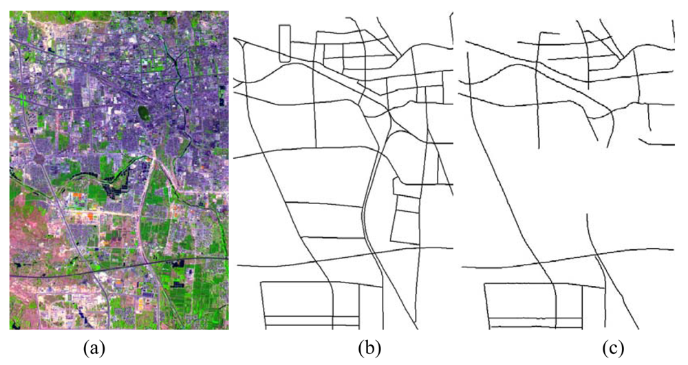 Road network extraction from an IKONOS satellite image. (a) IKONOS fused image with 1 m pixel-1 resolution and 9,374 pixels by 6,246 pixels image size; (b) the reference road network plotted; (c) the vector road network extracted by the combination strategy.