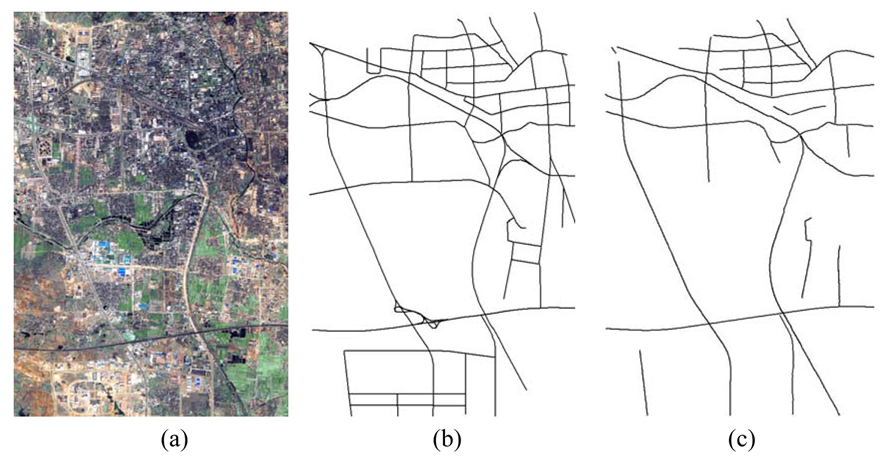 Road network extraction from a QuickBird satellite image. (a) QuickBird fused image with 0.61 m pixel-1 resolution and the image size is 15,368 pixels by 10,240 pixels; (b) the reference road network plotted; (c) the extracted vector road network by the combination strategy.