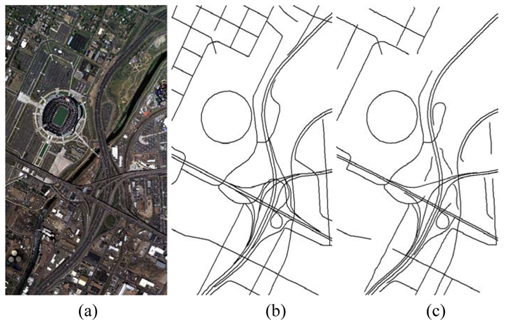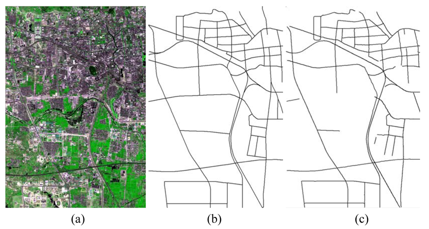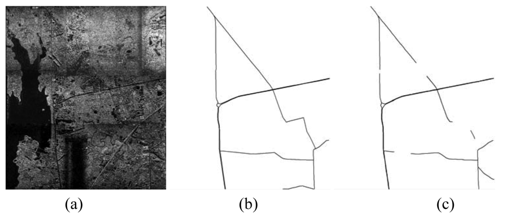 Road network extraction from an airborne SAR image. (a) Raw SAR image with 0.3 m pixel-1 resolution and 23,999 pixels by 20,172 pixels image size; (b) the reference road network plotted; (c) The extracted vector road network by PATS.