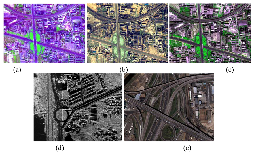 Various images in urban areas, suburban areas, or rural areas and images with different scales (resolutions from 2.5 m per pixel to 0.2 m per pixel) were tested to verify the capabilities of each road tracker: (1) a SPOT5 satellite image with a size of 3,750×2,499 pixels acquired in 2002 [see Figure 3(a)]. The GSD of this image is 2.5 m per pixel; (2) an IKONOS satellite image with a size of 9,374×6,246 pixels acquired in 2004 [see Figure 4(a)]. The GSD of the above image is 1 m per pixel; (3) a QuickBird satellite image with a size of 15,368×10,240 pixels acquired in 2005 [see Figure 5(a)]. The GSD of the image is 0.61 m per pixel; (4) an airborne SAR image with a size of 23,999×20,172 pixels (see Figure 6(a)). The GSD of it is 0.3 m per pixel; and (5) an aerial image acquired by a Zeiss Imaging's DMC camera with a size of 12,428×7,780 pixels [see Figure 7(a)]. The GSD of the image is 0.2 m per pixel. The images in (1), (2) and (3) are fused from their panchromatic band and multi-spectral bands by smoothing filter-based intensity modulation algorithm [36], and the geographic area for the images in (1), (2) and (3) is located at Tai'an, Shandong Province, P.R. China. Additionally, the SAR image is located at He'fei, Anhui Province, P.R. China, while the coverage area of the DMC image is within Denver, Colorado, USA.